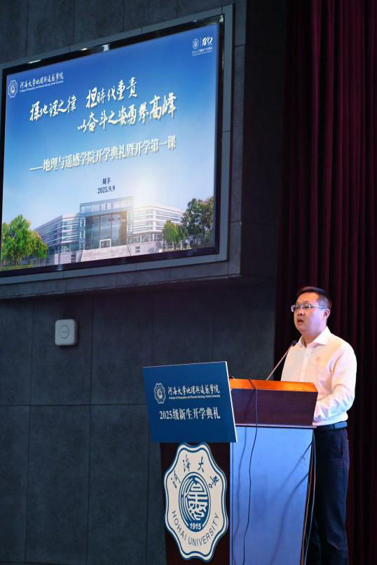 学院院长周丰以“探地理之律、担时代重责、以奋斗之姿勇攀高峰”为题讲解了“开学第一课”。他从 1915 年开设《本国地理》起步,到 2024 年获批地理学一级学科博士点,追溯学院文脉,梳理学科发展历程,彰显 “以水为特色、流域为单元” 的优势,展现学院在流域过程、灾害防控等领域的丰硕成果;以“过去一年的成绩单”为形式,向同学们介绍了学院学科建设、人才培养、国际合作等各方面的成果;最后,结合身边榜样的案例,以“为何奋斗、为谁奋斗、如何奋斗”展开寄语,希望同学们对接国家战略与社会需求,为山河守护与自我成长发力,锚定赛道、笃学慎思、融入集体、深接地气,做新时代地理求索者。