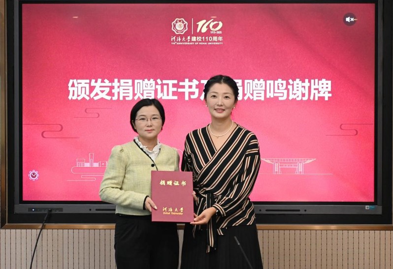李维代表学校,为中科宁图技术江苏有限公司颁发捐赠证书与捐赠鸣谢牌,芦园园总经理代表企业上台授牌。