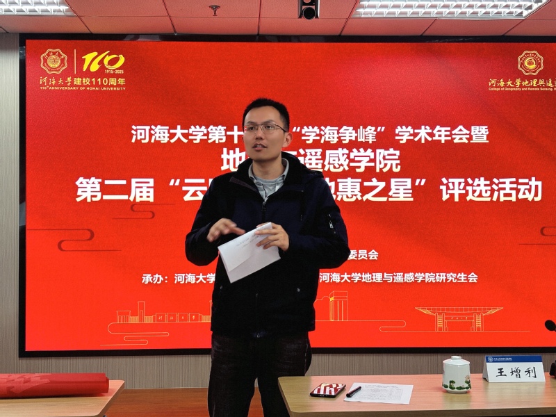 11月12日,开云电竞网第十四届“学海争峰”学术年会曁地理与遥感学院专场暨第二届“云图先峰·地惠之星”评选活动在行政楼301会议室举行。年会以“百十求索启新程,云图地惠谱华章”为主题,来自学院各专业的12位同学依次展示了他们所参与的最新研究成果,专业教师、研究生辅导员等共同参与了年会。