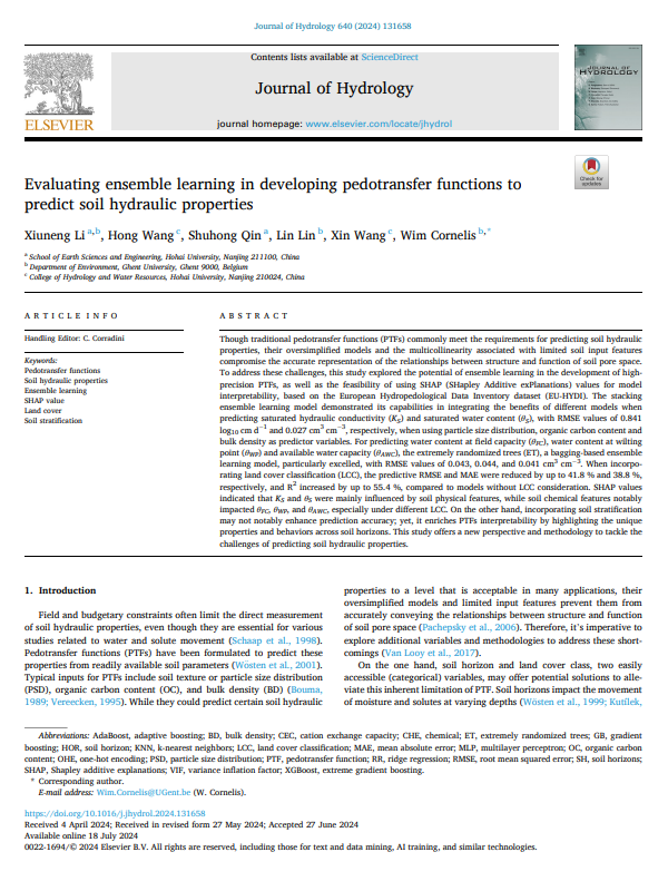 (4) Xiuneng Li, Wang Hong*,et al., Evaluating ensemble learning in developing pedotransfer functions to predict soil hydraulic properties, Journal of Hydrology, 2024, 640: 131658.