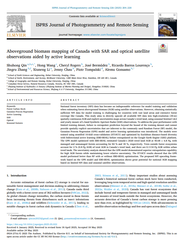 (2) Shuhong Qin, Wang Hong,et al., Aboveground biomass mapping of Canada with SAR and optical satellite observations aided by active learning, ISPRS Journal of Photogrammetry and Remote Sensing, 2025, 226: 204–220.