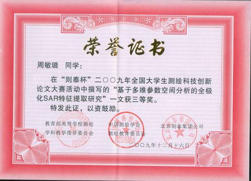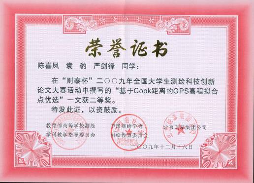 | 测绘工程系学生在“则泰杯”2009年全国大学生测绘科技创新论文大赛活动中取得优异成绩 | | 为了全面展示我国测绘教育成果,激发广大学生崇尚科学、勤奋学习、挑战未来的进取精神,促进优秀测绘人才和优秀测绘成果的涌现,推动测绘教育事业的发展。2009年由教育部高等院校测绘学科教学指导委员会、中国测绘学会测绘教育委员会与北京则泰盛业科技发展有限公司联合举办了首届大学生“则泰杯”全国测绘科技创新论文大赛活动,日前在桂林理工大学举办了颁奖,我校四篇论文分获大赛二、三等奖。 大赛通过前期广泛征集,经以中国工程院院士宁津生为主席、由全国15位专家学者组成的评委会评审,共有40篇来自不同高等院校的论文获奖,其中一等奖5篇,二等奖15篇,三等奖20篇。我校地球科学与工程学院测绘科学与工程系共有四篇论文获奖,其中刘岭(指导老师:黄腾)、陈喜凤 袁豹 严剑锋(指导老师:岳东杰)同学的论文获二等奖,周敏璐(指导老师:杨英宝)、詹勇(指导老师:徐佳)同学的论文获三等奖。 | |