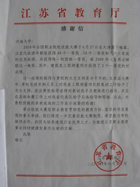 2010年全国职业院校技能大赛,江苏省代表团取得了优异的成绩,我院派出测绘工程系的黄张裕老师对集训选手及教练进行指导,获得江苏省教育厅的表扬。