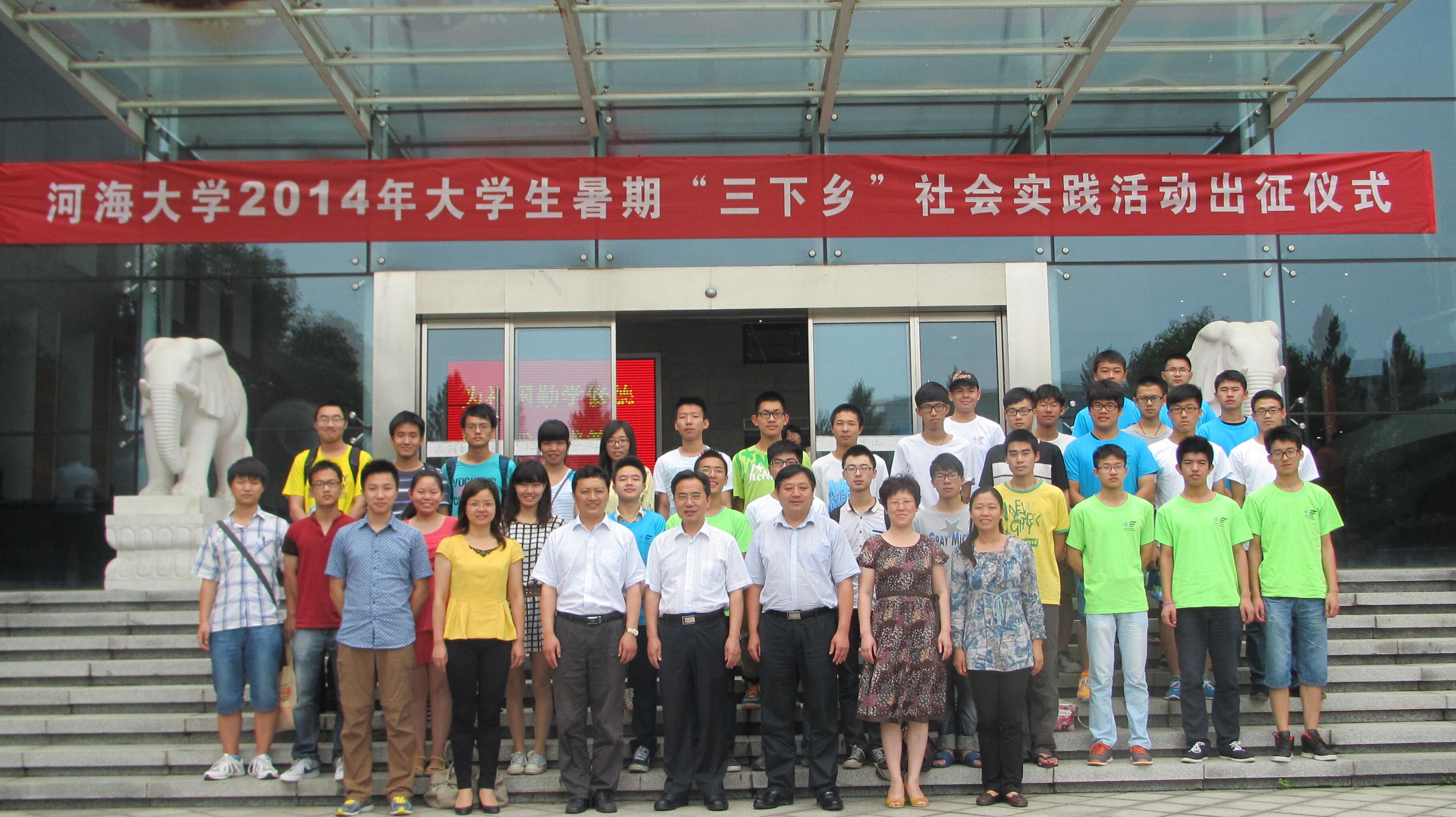 地学院2014年暑期社会实践出征仪式圆满成功 2014年7月2日下午,地球科学与工程学院2014年暑期社会实践各分队队员于致用118举行了出征仪式。院党委副书记宋瑞平书记,院团委书记郑茜丹老师,2013级辅导员林牧老师出席了本次出征仪式。 本次暑期社会实践中,地学院共有29支实践队伍,其中省级团队1支,校级重点团队1支,校级一般团队6支,院级团队21支。仪式中,学院强调了暑期社会实践的安全问题和突发事件的处理办法,进行了安全教育和培训,要求大家在社会实践的每个环节树立安全意识,做到平安、顺利的完成社会实践活动。
