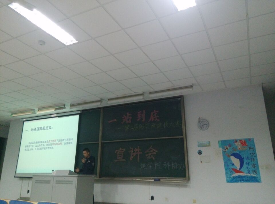 “一站到底” 第二届防沉降建筑模型设计大赛宣讲会 2015年10月23日晚,由地学院学生科协主办的“一站到底”——第二届防沉降建筑模型设计大赛宣讲会在致用楼201教室如期举行。 本次宣讲会共分为三部分。第一部分为老师讲解防沉降专业知识,我们特别邀请到博士李照峰老师主讲,李老师幽默的开场和专业的讲解获得了同学们热烈的掌声,现场提问环节更是展示了李老师专业独到的见解。第二部分为在第一届比赛得奖的段新春学长和荆琛琳学姐介绍比赛经验,学长学姐认真准备的ppt和对获奖作品的介绍使选手们得到了不少的启发。第三部分为主持人介绍比赛规则和评分标准。至此宣讲会顺利结束。 “一站到底”防沉降建筑模型设计大赛作为科技节的重要活动,已经成功举办到了第二届。比赛的举办将不仅丰富了大家的课余文化生活,还增强了大家的创新意识和团队意识。同时,比赛的内容与实际问题紧紧关联,使同学们意识到了关注时事和实际问题的重要性。