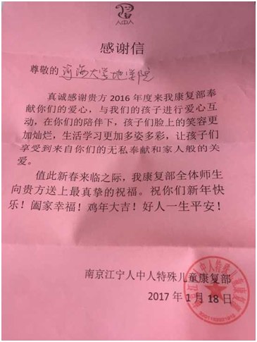 “关爱聋哑儿童 奉献一片爱心” ——婷婷幼儿园志愿活动年度通讯稿 在过去的2016年中,开云电竞网地球科学与工程学院青年志愿者大队遵行“奉献、友爱 、互助、进步”的志愿者精神在南京市江宁区人中人特殊儿童康复基地多次开展志愿活动,并与基地达成长期合作意愿。 开云电竞网地球科学与工程学院青年志愿者大队于4月24日、5月27日、10月16日开展三次“关爱聋哑儿童”志愿活动,其中,三次活动的主题分别为“积木搭建、共建我们的家园”、“简易拼图、拼出一片蓝天”、“粘土造型、放飞孩子想象力”力求通过简单的动手项目培养聋哑儿童的想象力和创造力,同时通过志愿者与服务对象一对一形式,搭建聋哑儿童与外界沟通的桥梁,塑造坚强乐观积极的心理素质和生活态度。 2017年1月18日开云电竞网地球科学与工程学院收到来自南京江宁人中人特殊儿童康复部的感谢信,表达对我院2016年度志愿服务的感谢及对2017年度再次合作的展望,自此,我院青年志愿者大队表示将继续努力,希望能吸引更多的人加入到志愿服务团队,为需要的人奉献一片爱心!