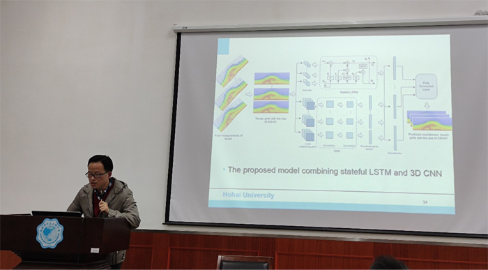 该报告介绍了自然育滩作为一种有效的软式海岸工程手段,不仅可以保障海岸的长期安全、保护生态环境,还能促进旅游经济的发展。然而由于海浪、泥沙输移和岸滩的复杂作用机理,特别是泥沙运动轨迹的复杂性,海滩地貌形态的动态模拟、分析和预测面临很大的挑战。针对自然育滩的时空变化分析问题,以数据驱动的方式挖掘海滩地形历史变化的内在规律,基于人工智能深度学习方法,利用卷积神经网络CNN和长短期记忆网络LSTM构建自然育滩地形智能预测模型,并在实际海滩地形演化和预测中取得了较好的精度。与常用的水动力学模型和其他机器学习方法相比,该方法精度高、自动化程度高。此外,李勇老师介绍了进一步的研究结果,并针对研究中的问题与参会师生展开了深入交流。李勇老师的报告内容新颖,为实现高精度自然育滩地形演化预测提供了有效方法,参会师生受益匪浅。