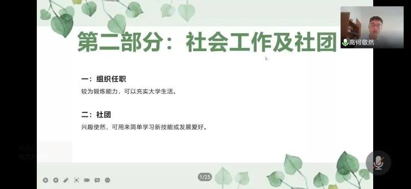 为帮助新生尽快了解大学的学习生活,引导新生顺利进行角色转变,地学院于2021年9月12日通过腾讯会议的形式开展新生梦想公开课。本次公开课邀请到2019级许凌玮、高何敬然作为优秀学生代表分别从社会工作、校园生活进行经验分享。