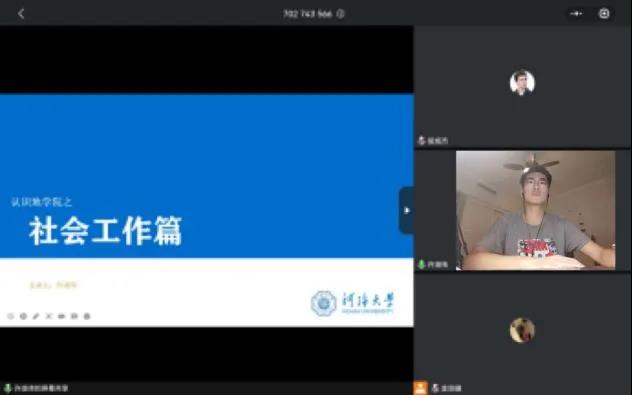 首先由许凌玮同学向学弟学妹们分享自己的社会工作经验。大一时期,作为青协企划部的一名干事,他积极参与校内外各种志愿活动。从接受社区培训到困境儿童服务,从地质知识科普到社区老人走访,他借用自身经历的故事调动同学们参与志愿服务的热情,鼓励同学们在社会工作中贡献着自己的一份力量。最后,他希望大家在之后的学生组织宣讲时认真了解地学院的五大组织,选择自己感兴趣的组织,大胆去尝试,在不多的时间里成长!