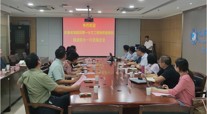 2022年9月27日,安徽省地勘局第一水文工程地质勘查院党委书记兼院长姚波等一行7人来到我院开展调研交流并签订战略合作协议,我院院长刘瑾、副院长杨英宝、副院长茅昌平、副院长窦智、党委副书记杨天、地质科学与工程系主任魏继红、副系主任赵燕容、地球关键带研究所所长谭红兵、水文地质与环境研究所所长黄勇、副所长陈舟,测绘工程研究所所长黄其欢、测绘科学与工程系副系主任沈月千和部分教师代表等出席本次交流活动,会议由窦智副院长主持。