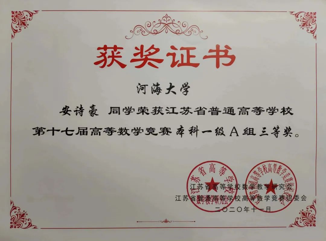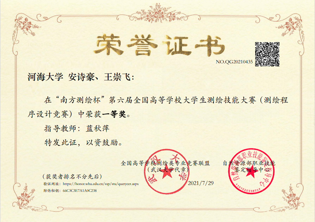 “书山有路勤为径,学海无涯苦作舟”。自入学以来,安诗豪就认真的学习专业知识,大学生活的丰富多彩没有让他迷失方向,他始终坚信,要想获得成功,就要付出的比别人多。所以他放弃了很多玩乐的时间,去图书馆、自习室,从专业课本到课外读物,努力学习那些以后能用得上的知识和信息。他懂得拼搏,刻苦勤奋,一丝不苟,更有自己的长期计划和短期计划,充分利用课堂和课余时间,提高学习效率的同时也锻炼了意志。 进入大学以来他的成绩一直保持在专业前三名,获得了多项校级奖学金,一次性通过了英语四六级、江苏省计算机二级和全国计算机二级。除了学习基础外,他还积极参与比赛科研,目前作为负责人主持校级创新训练项目一项,在江苏省和全国的大学生数学竞赛中都荣获三等奖。他在比赛中学习,在比赛中进步。在“南方测绘杯”举办期间,他主动选择留校备赛,两个月间遇到了种种的困难。他参赛的测绘程序设计竞赛形式为“现场随机抽题、从零开始编程”,庞大的题库覆盖了测绘工程专业的所有专业课程,其中超过50%的题目都属于大三、大四课程。而安诗豪当时仅仅完成大二学业,大量的知识盲区给他们造成了巨大的心理压力。他和老师通过各种途径收集了历届比赛使用过的题目,针对每一道题目设计推导算法原理、打磨程序细节,深入学习他尚未学习的专业知识。当碰到不太有把握的题目,他偶尔出现“差不多就行”的想法时,他想到老师的告诫——“测绘就是工程建设的尺子、导航定位的眼睛”,容不得半点马虎,又进一步找到相关课程任课老师一起讨论。经过两个多月、每天超过10小时的高强度备赛,他终于完成了备赛。最终,作为程序设计比赛小组的组长,他在全国决赛中圆满完成全部任务,按时提交编程成果和设计报告,从177组决赛队伍中脱颖而出,获得了一等奖,为开云电竞网代表队获得团体一等奖做出了坚实贡献。