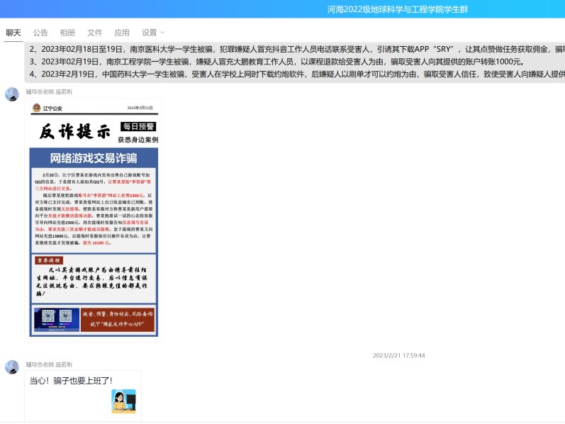 学院将防诈骗工作融入进日常工作中,每周依托“平安江宁”、“南京反诈中心”等公众号发布的防诈骗信息,在年级群进行转发宣传,时刻提醒同学们提升防诈骗意识。