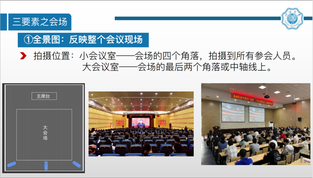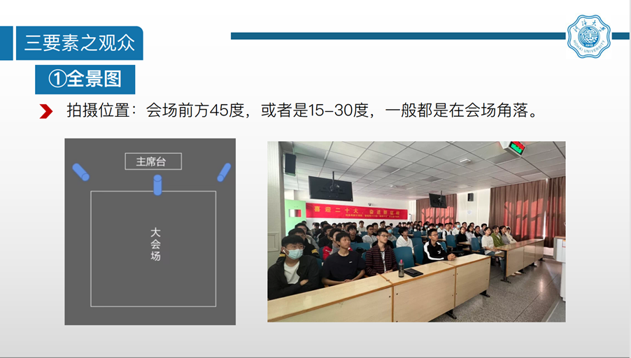 田妍同学围绕主题“各类场景拍摄技巧”首先提出为什么要学习拍摄技巧,接着讲述了“拍摄流程”,“拍摄误区”,“会场、领导、观众三要素”和“曝光三要素”,并强调了“会前充分准备,会中统筹协调,会后精细挑选”的会场拍摄技巧,以及室内外不同的拍照技巧和各个点位及其拍摄角度,使用相机时光圈、快门速度和感光度的重要作用。