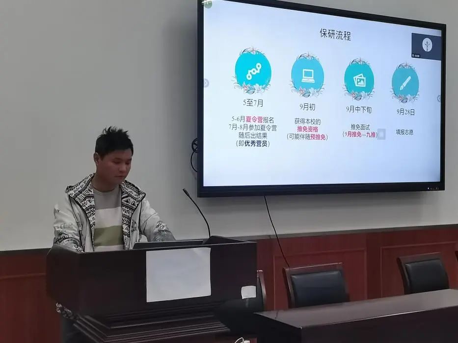 王昊同学从保研流程介绍、校内资源获取、校外资源获取、同济复试经验四个方面进行了介绍。王昊同学重点了介绍保研流程中的夏令营和九推部分。他提到,夏令营和九推要多关注各学校学院的官网通知,注意时间节点,注意英语面试和专业知识的储备。王昊同学结合自身同济复试经验从流程、英语复试、综合面试三个方面出发,建议提前做好专业英语的学习和积累,提高口语能力,争取做到流利回答专业问题,在综合面试时不要太过于焦虑,从容应对。他希望同学们不要妄自菲薄,要大胆尝试,对自己有充分的自信,也不要轻易说放弃,努力奋斗。最后,王昊同学寄语大家:人生由无限可能,希望大家都能成功去到自己心仪的学校。