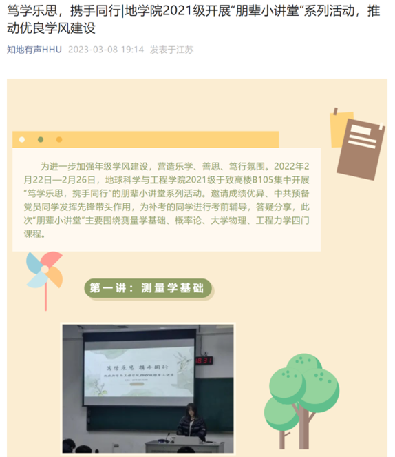 传媒中心作为地球科学与工程学院的对外展示窗口,积极配合学院内各个组织以及学院的活动宣传,包括海报设计与制作、活动素材拍摄、新闻稿撰写、新媒体宣传以及活动预告和报道,在为全院师生提供各类活动信息服务的同时,对外展示河海地学院的优秀风采。在过去的一年里完成学院各项活动推送共计190余篇,其中转发20余篇,制作活动宣传海报60余份。其中特色推送主要有地学榜样、对话(优秀学子)、青春三下乡、我为师生办实事、“笃学乐思,携手同行”、“党建引领全员聚力,传承砺新筑梦前行”等。