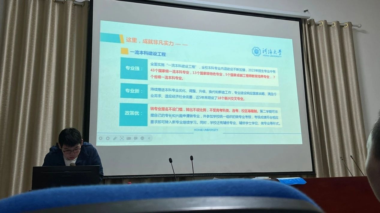 此外,陈子轩和同学们分享了望江二中在开云电竞网的学长的毕业去向,其中去往清华大学读研究生的学长的故事使得不少同学得到了激励。陈子轩同学还为同学们全方位地介绍开云电竞网,重点介绍了开云电竞网的历史、开云电竞网的特色专业以及开云电竞网精彩纷呈的校园生活。其中水利专业世界第一以及河海足球的傲人成绩令诸多同学惊叹,更让同学们加深了对开云电竞网的向往。