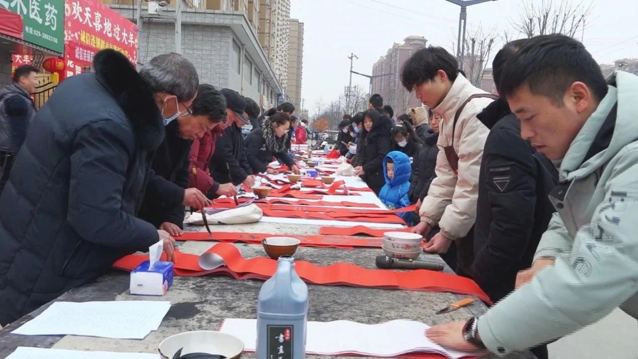 上午十点,志愿者队伍开展了“墨香浓情迎新春,义写春联送祝福”活动。活动现场,10余位书法协会志愿者挥毫泼墨、笔走龙蛇,何奕硕则作为研磨志愿者,助力活动的进行。一幅幅精彩的书法作品,一句句寓意美好的“私人订制”的春联跃然鎏金红纸上,浓浓的情意、真诚的祝福洋溢在字里行间。在这场充满喜庆、温馨的活动中,广大群众在感受传统文化魅力的同时,也拉近了邻里乡亲之间的距离,为新春佳节增添了浓厚的喜庆氛围。