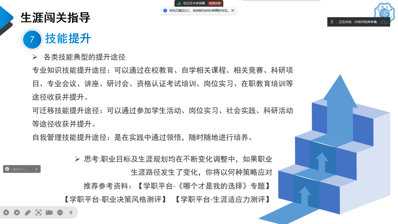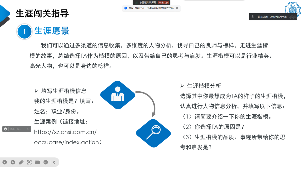 常老师围绕生涯愿景、专业探索、职业瞭望、兴趣揭秘、目标锚定、能力盘点、技能提升七个方面展开详细的生涯闯关指导。常老师告诉同学们专业探索是外部世界探索的重要内容,各位同学要学会通过资料查阅法、访谈法、实践法了解自己的目标行业就业背景、就业门槛等信息。在职业瞭望部分,常老师鼓励同学们跳出岗位局限,全面了解职业世界。