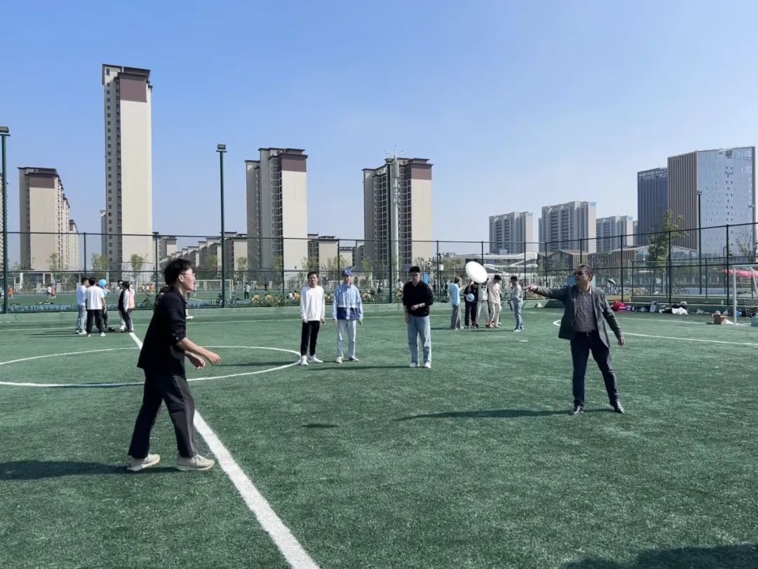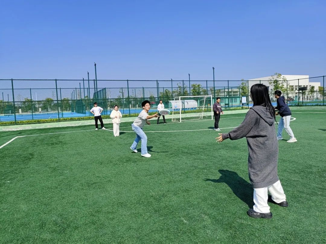 在飞盘接力环节,各组成员默契配合,飞盘在空中划出一道道优美的弧线。组内队员们全神贯注,眼神紧紧跟随飞盘的轨迹,每一次成功的传递都引来阵阵喝彩,更是将活动推向了高潮。