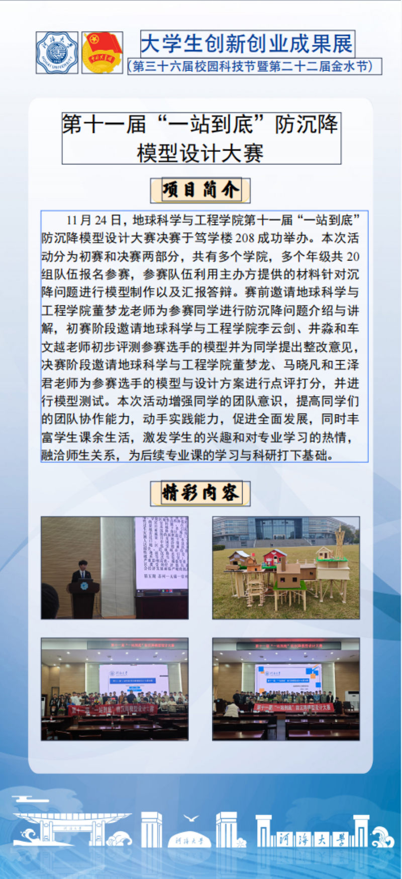 2024年,地学院科协以科技创新引领为主线,致力于服务学生拔尖创新能力培养,开展“第八届智绘杯测绘地理信息创新创业大赛”、“第十一届‘一站到底’防沉降大赛”、“大学生创新创业训练计划动员大会”、“大学生创新创业训练计划(2024-2025)院级立项答辩”、“大学生创新创业训练计划(2023-2024)结项答辩”等创新创业活动累计16场,鼓励全院学生积极参与科研竞赛活动,助力学院孵化和培育优秀双创项目。