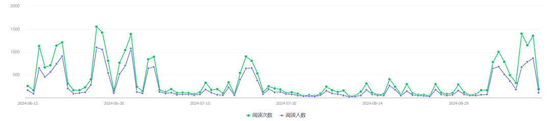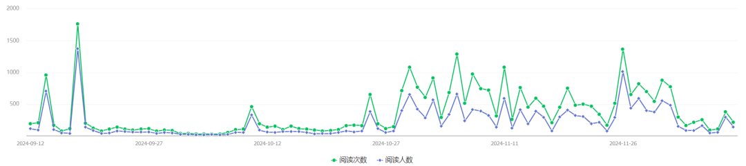 其中,9月18日“知地有声HHU”日阅读量及日阅读人次达到年度峰值。推送文章“喜报 | 我院地质工程专业本科生在第七届全国大学生地质技能竞赛中斩获佳绩”,详细报道学院地质工程专业同学在该竞赛中取得的突出成绩,吸引大量校内外读者的点击与转发,提高学院的学术影响力,增强学院学生的自豪感与归属感。此外,公众号在六月份和十月底以来迎来了两个阅读量高峰期,平均日阅读量可达千次。主要涉及推送“地学吾师”、“地学榜样”系列栏目文章,接连报道学院优秀教师的教学成果与科研成就,以及在学习、科研等方面有突出成绩的优秀学子及其事迹,展示学院师生的卓越风采,凸显学院在地学学科领域中的凸出影响力与成就。