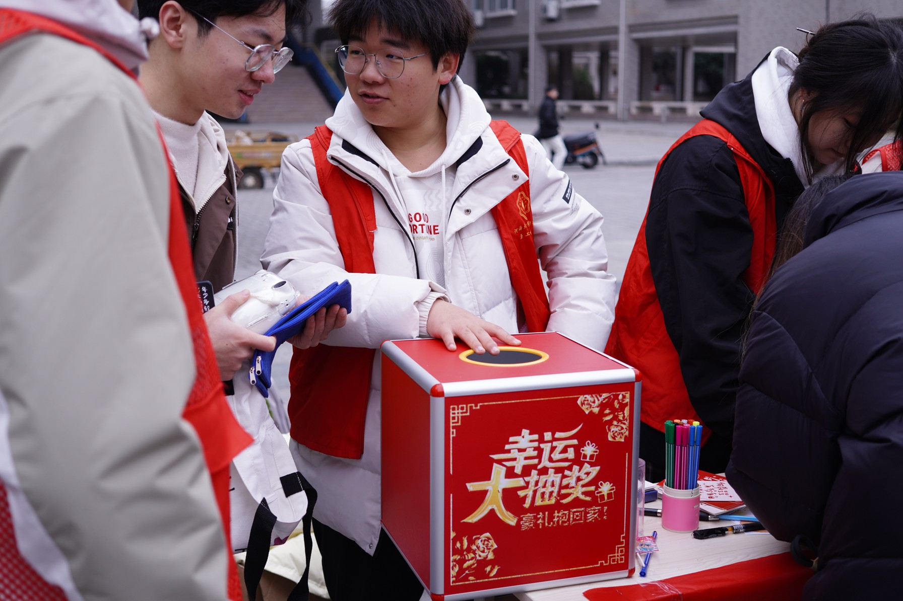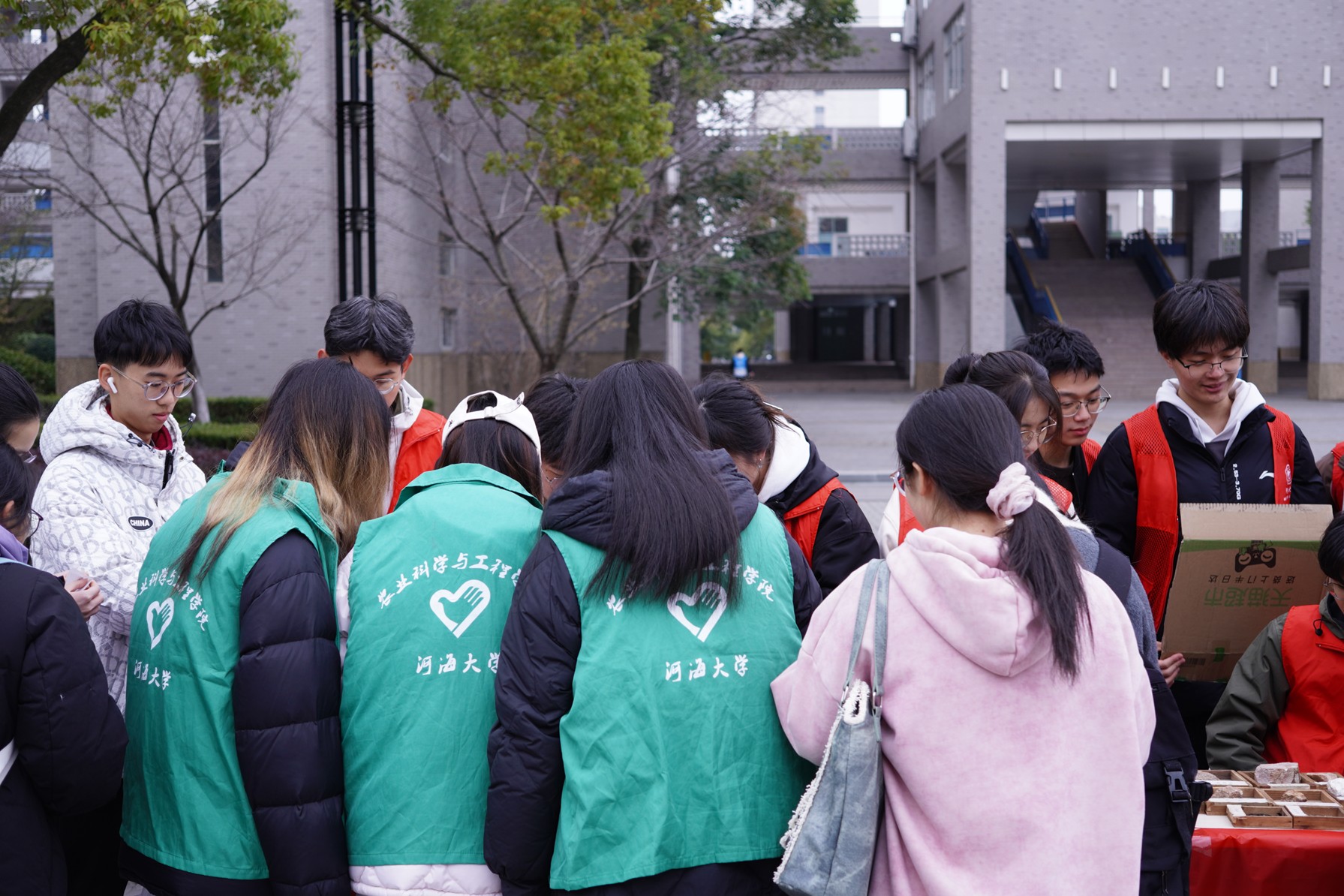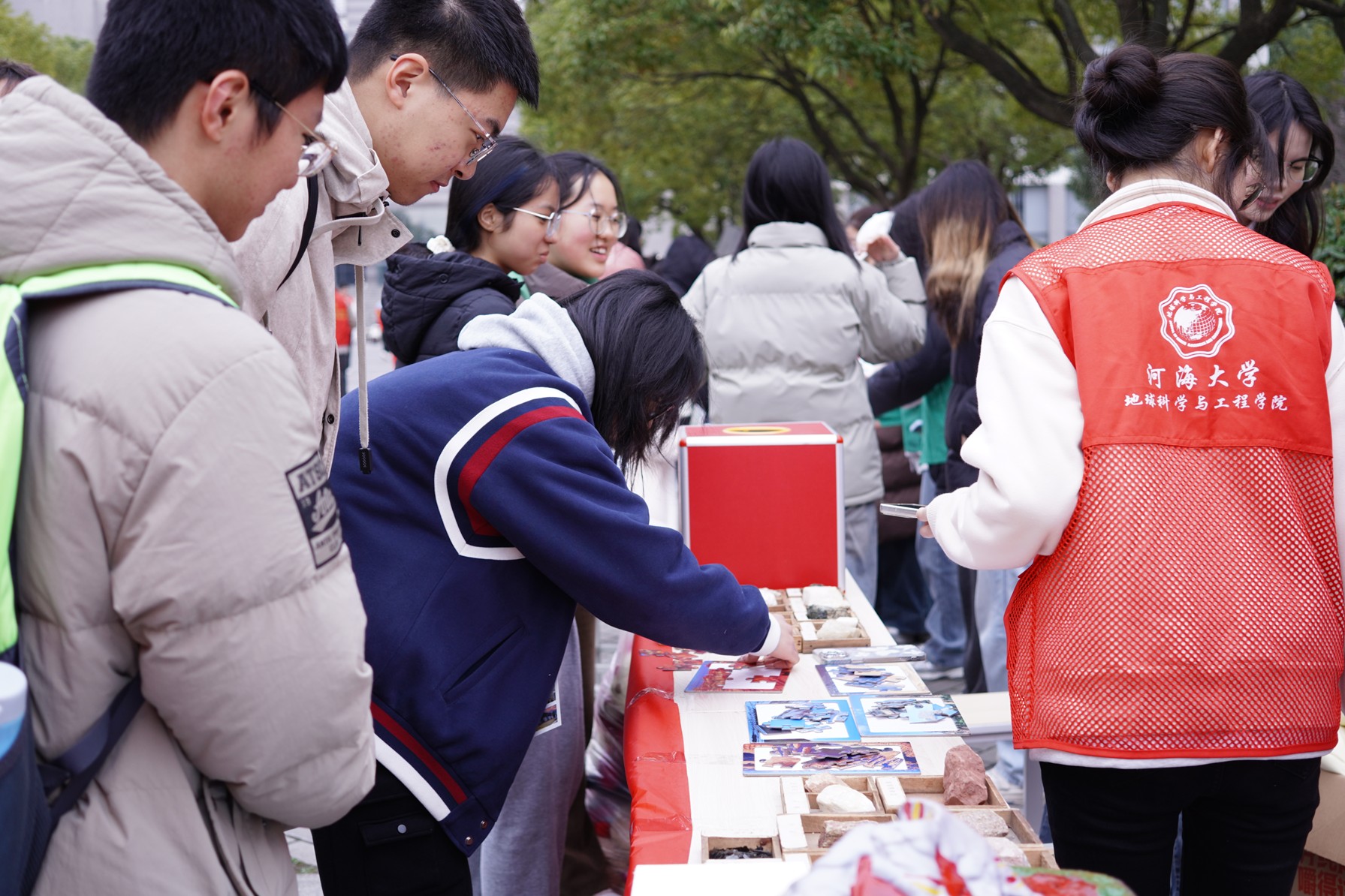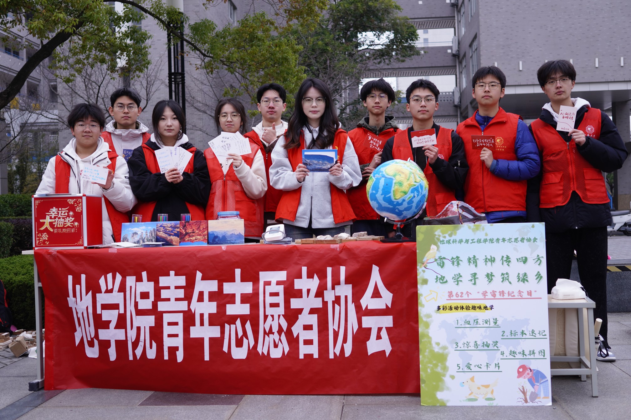 活动现场,青协志愿者们早早抵达江宁校区的小浪底广场,进行场地布置。志愿者们精心策划了四项富有创意的活动:血压测量体验、岩石记忆趣味游戏、地貌拼图挑战以及为山区儿童写明信片的爱心行动。参与者完成各项活动后,还有机会参加抽奖环节,进一步增强了活动的吸引力。 在活动过程中,志愿者们展现出高度的热情和专业的态度。他们在各个板块中担任不同角色,确保活动顺利进行。