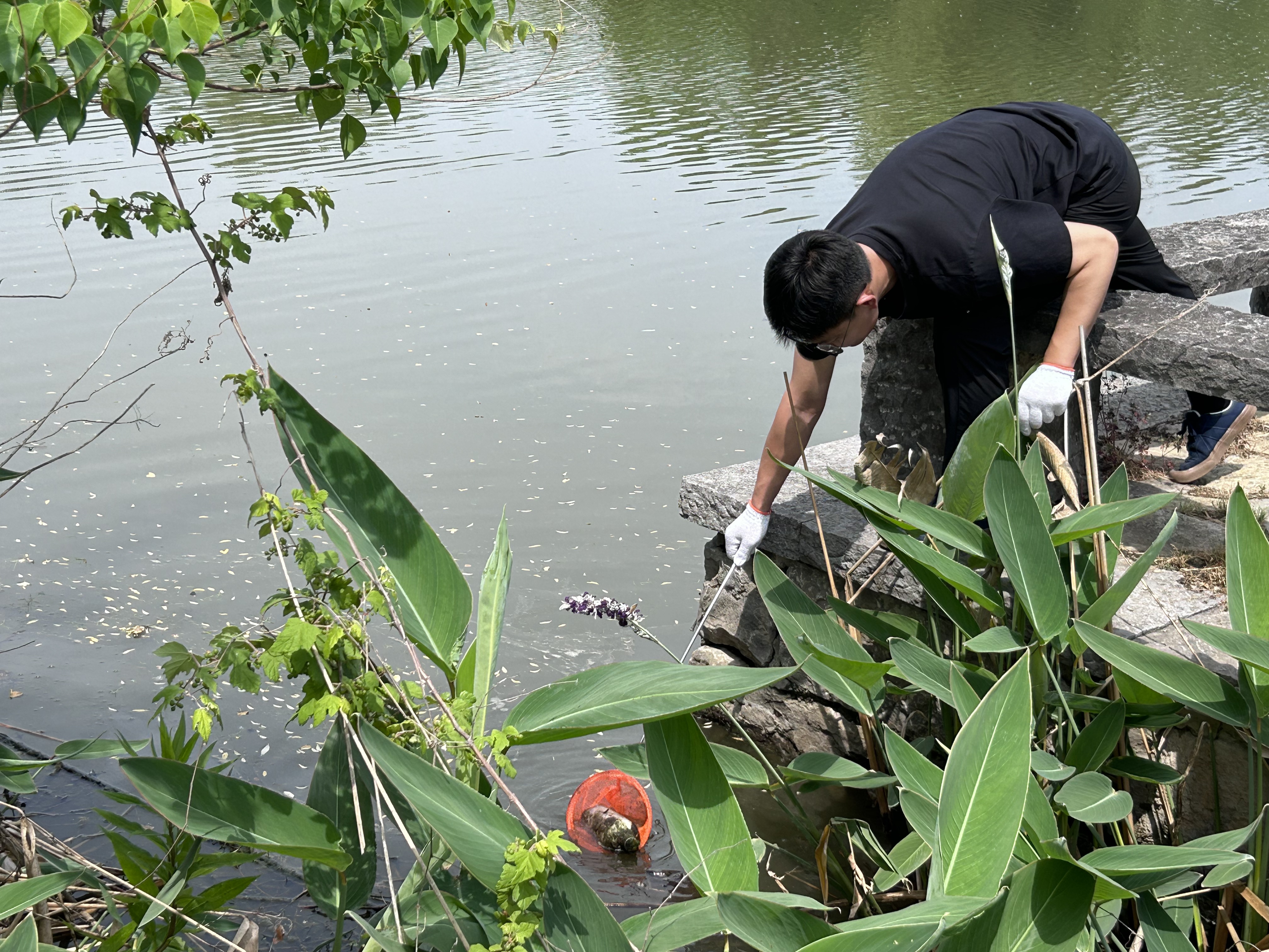 本次户外生态实践活动以科学分区、精准治理为特色,划分“草坪生态带”、“河道净化区”两大责任区域,系统性推进生态修复。研究生同学使用长柄夹、可降解垃圾袋等工具,对草坪区域进行地毯式排查。重点清理塑料瓶、烟头、食品包装等肉眼可见垃圾,同时对深埋草根的玻璃碎片、金属残片进行深度挖掘,避免对土壤生态系统造成长期危害。针对杨柳湖支流河道,研究生同学采用不锈钢抄网实施“上下联动”治理,上层打捞水面漂浮的泡沫板、塑料瓶等垃圾;中层打捞悬浮的枯枝落叶及藻类堆积物;下层打捞沉积于河床的玻璃瓶、废旧衣物。