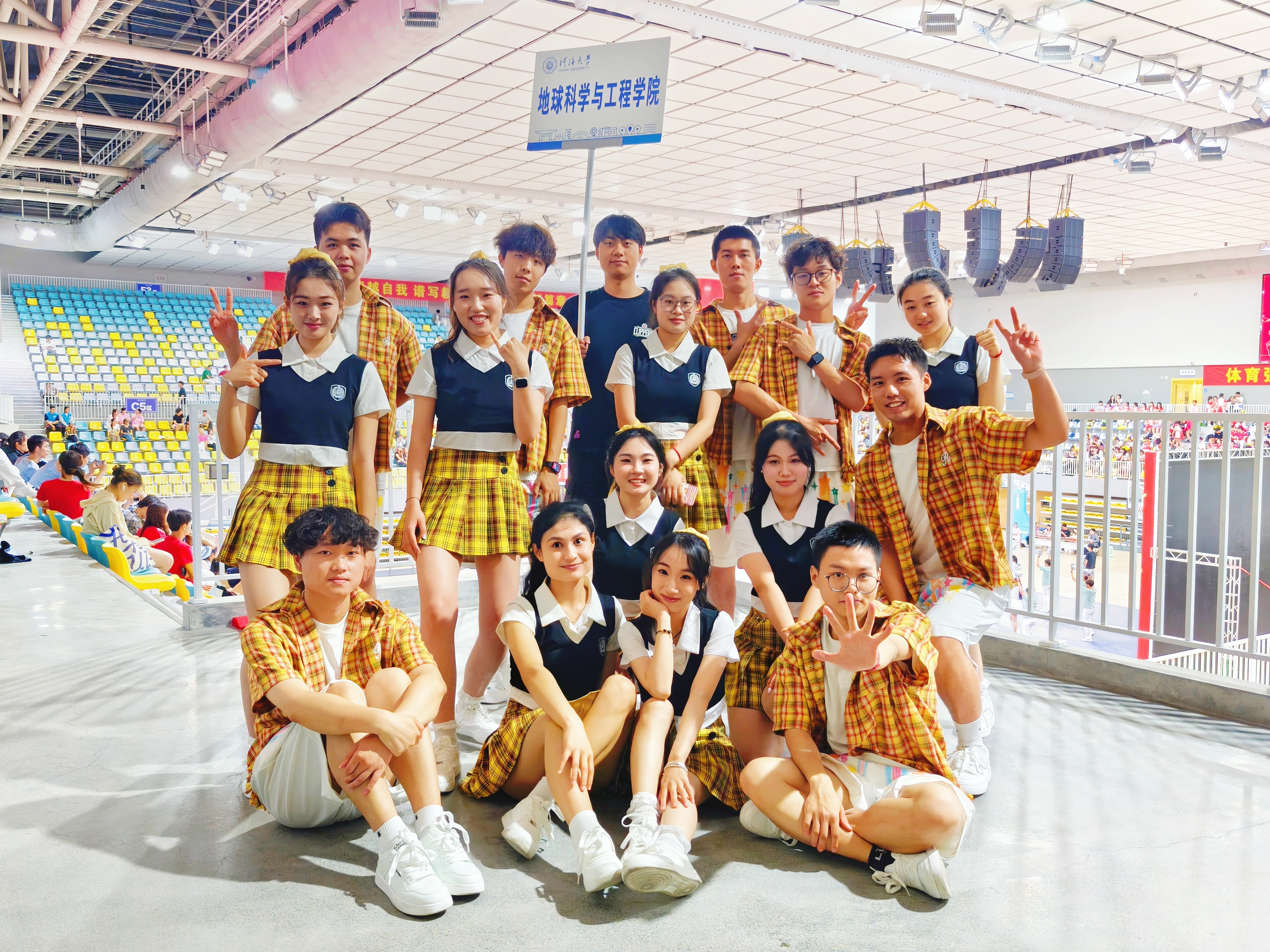 当日下午,伴随着主持人激昂的报幕,“地表最强啦啦队”闪亮登场!队员们身着极具辨识度的队服——女生亮黄色格纹短裙搭配经典黑白上衣,男生亮黄色格纹短袖配以利落白色短裤,宛如一片跃动的阳光瞬间点亮整个场馆。这抹明亮的“地学黄”,象征着探索的活力与地质的热情,一亮相便牢牢锁住全场目光。他们步伐矫健,队列整齐,眼神中闪烁着自信与坚定。开场造型站定,一声嘹亮的口号响彻穹顶:“探秘地球,造福人类;河海地学,大有可为!”其声如金石坠地,气势磅礴,不仅喊出了地学人的崇高使命,更点燃了现场观众的热情,为接下来的精彩表演奏响了最强序曲!