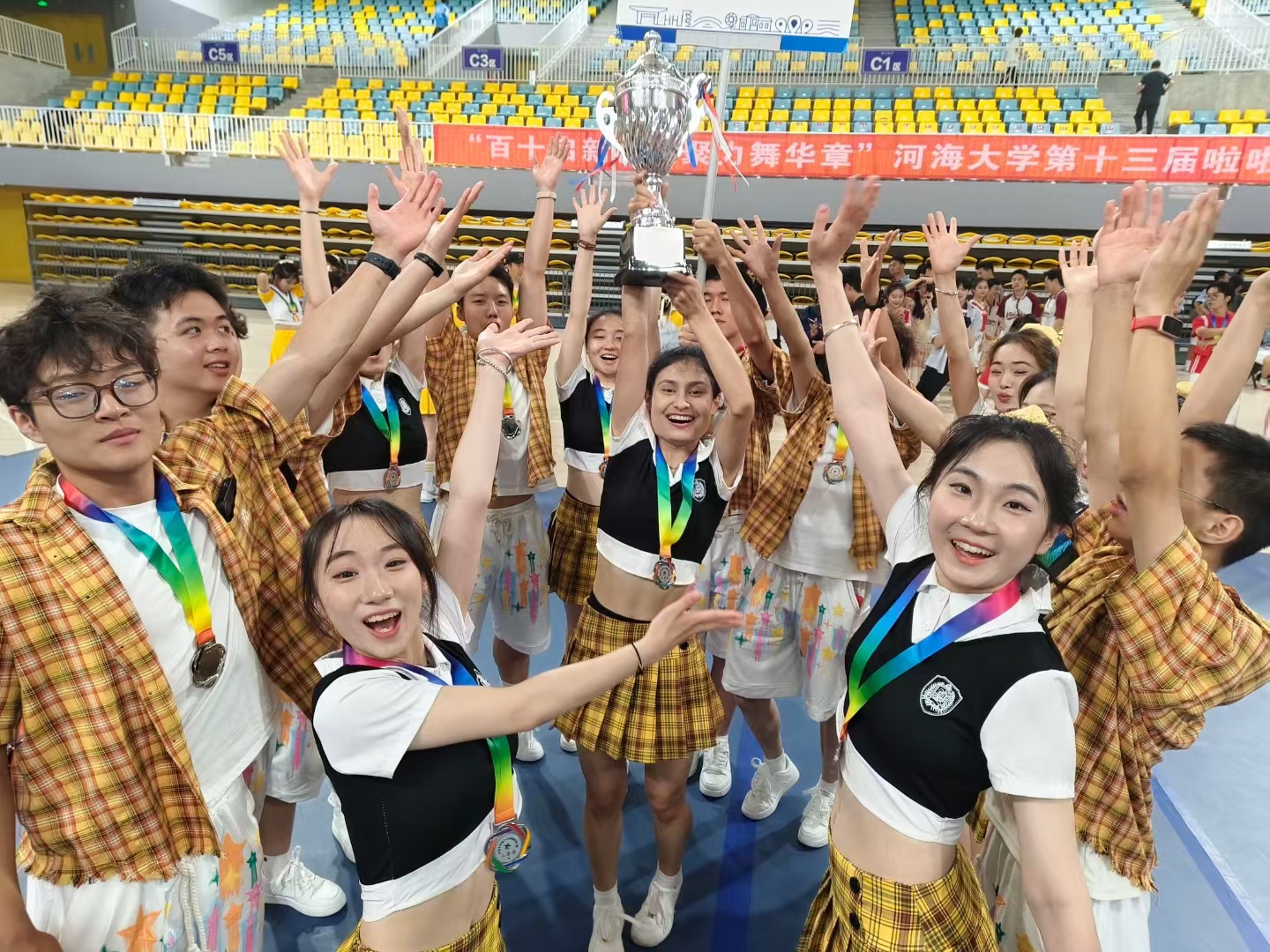 队员们脸上始终洋溢着阳光般灿烂的笑容,眼神明亮而专注。手中挥舞的花球与亮黄色队服交相辉映,舞动间仿佛汇聚成璀璨星河。他们将青春的无限活力与地学人特有的蓬勃朝气,通过极具感染力的肢体语言,毫无保留地倾洒在赛场之上!