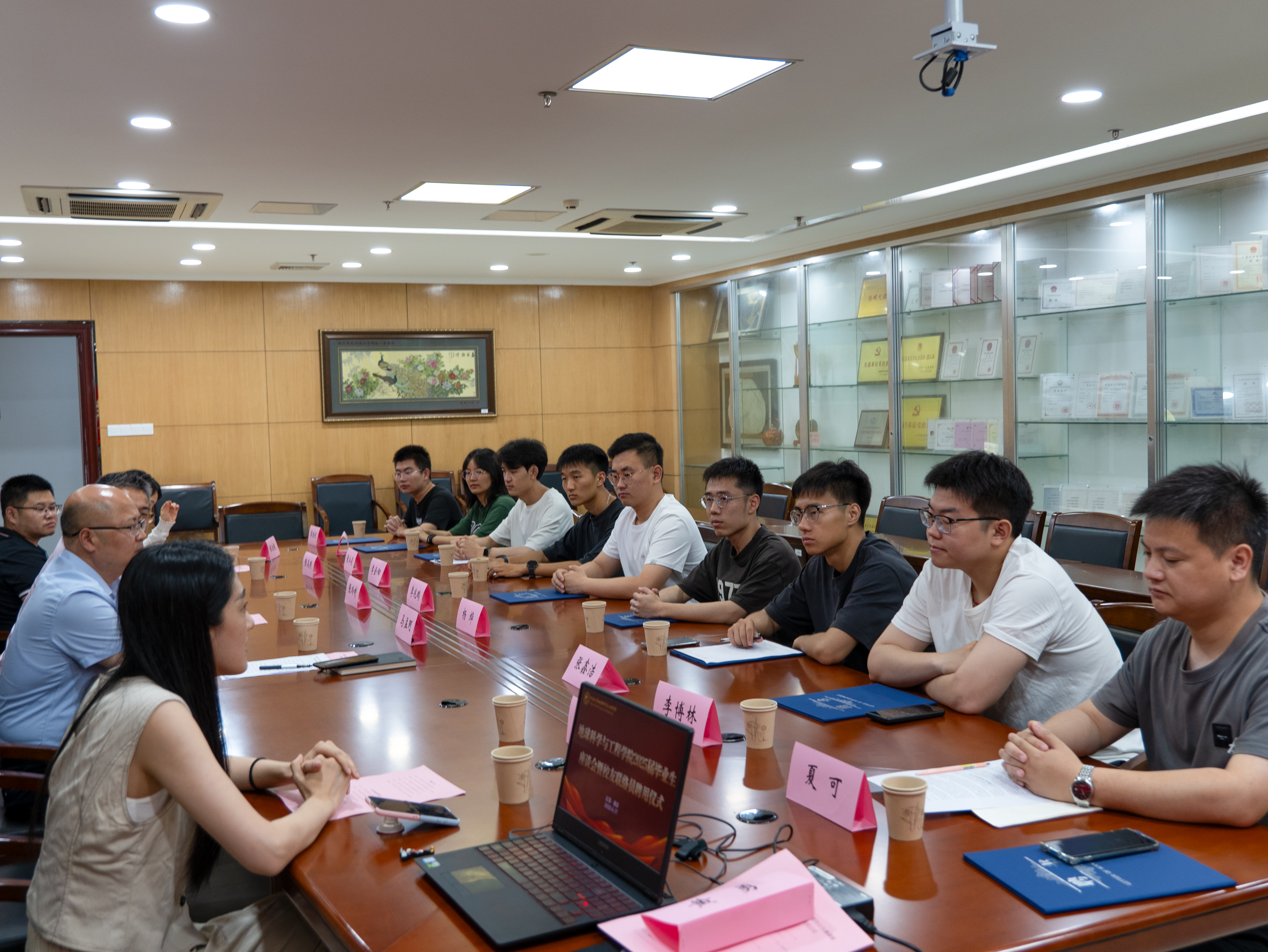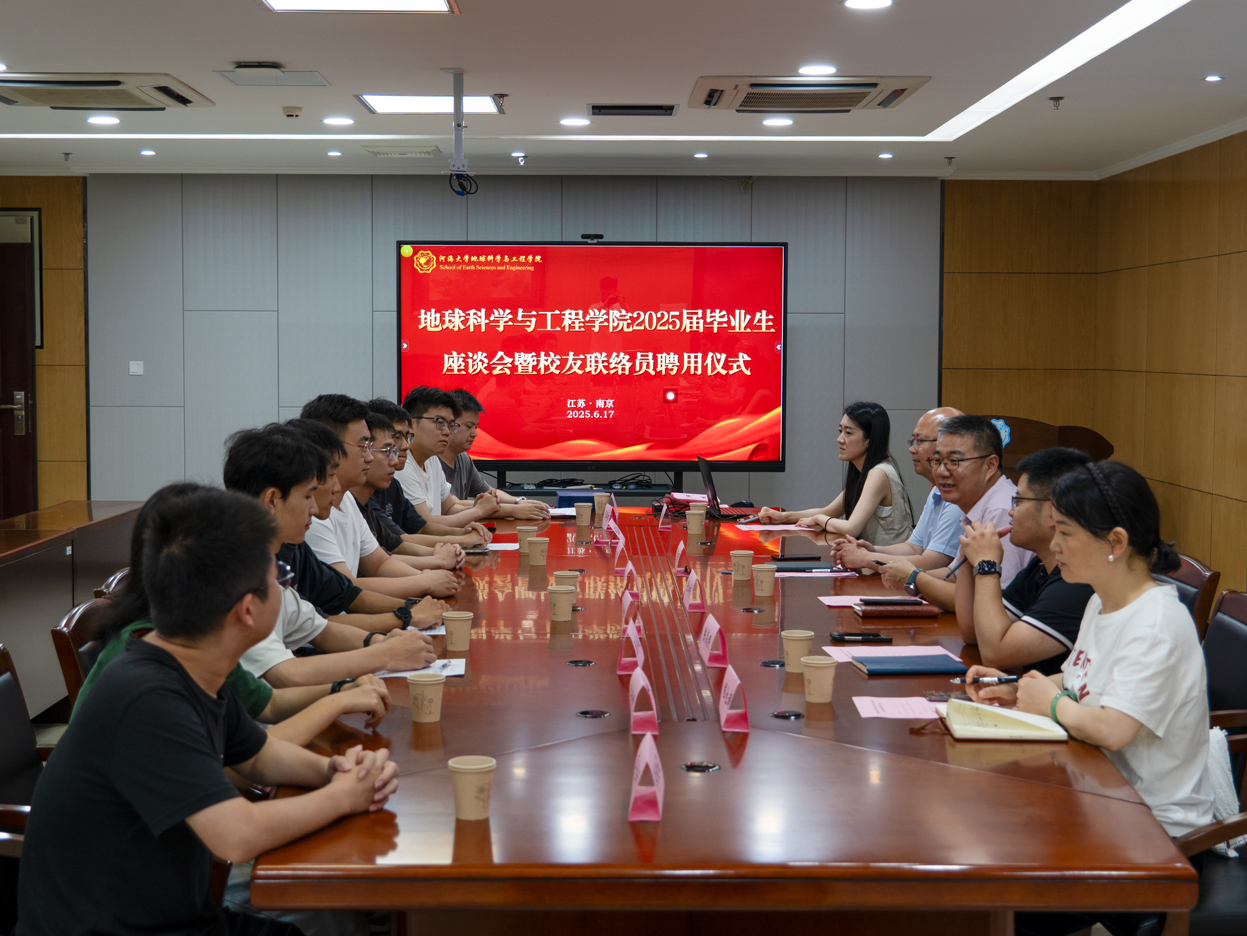 6月17日上午10 : 00,地球科学与工程学院在笃学楼925会议室举行2025届毕业生校友联络员聘任仪式暨毕业生代表座谈会。学院党委书记马孟珂,党委副书记、副院长张玲彬,测绘系副系主任陈焱明,辅导员程池超、闫蕴琦出席会议,9名毕业生代表参加,党委副书记、副院长张玲彬主持仪式。