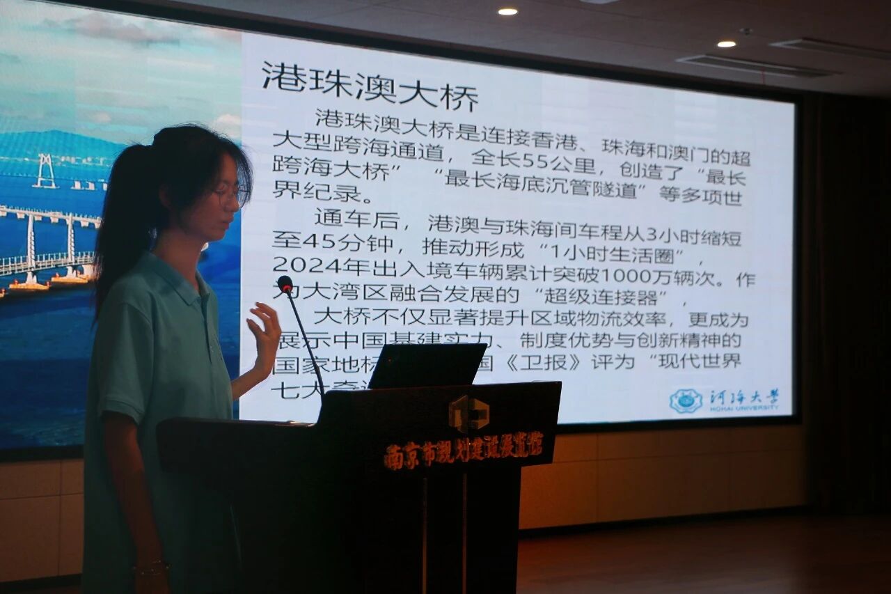 首先,实践团成员结合在中铁大桥局二公司的走访经历,以南京长江大桥、大胜关长江大桥等标志性工程为例,向同学们生动讲述了桥梁建设背后的故事。团队成员分享了桥梁工程师们如何在复杂地质条件下攻坚克难,以及建设者们“逢山开路、遇水架桥”的奋斗精神。