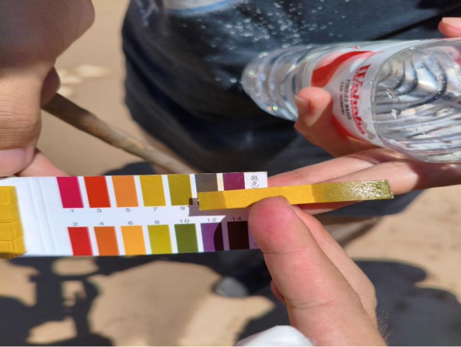 在小浪底水利枢纽风景区,团队成员着重考察岩石土壤、水质以及生物资源,在游览过程中观察当地植被,岩石并通过网络查询植物名称习性岩石名称岩性。在黄河浅滩,团队成员不仅观察了水生生物并通过手机软件识别查询,而且使用矿泉水瓶采集水样进行PH检测。