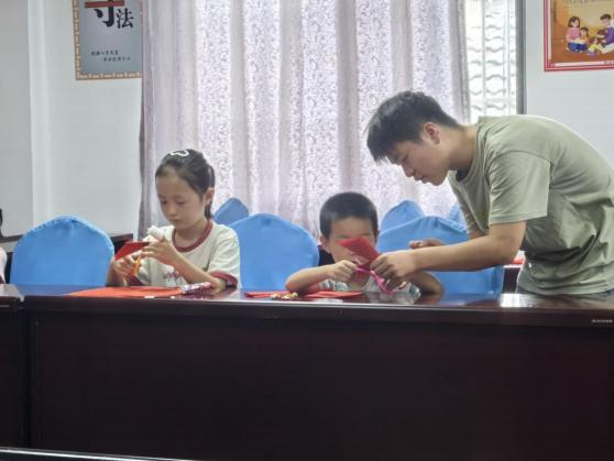 随后,在实践环节中,小朋友们在实践团队成员的指导下,纷纷拿起彩纸和剪刀,开始制作属于自己的剪纸作品。一开始,有些小朋友由于手法生疏,在剪裁过程中遇到了一些困难,但在团队成员的耐心帮助下,他们逐渐掌握了技巧,动作也越来越熟练。其他团队成员也积极穿梭在小朋友们中间,及时给予他们鼓励和支持,帮助他们解决各种问题。大家互相交流、互相学习,现场洋溢着欢乐的气氛,耐心的沟通和欢声笑语不断。