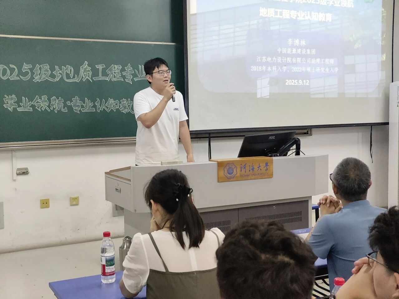 会议伊始,南京市水利规划设计院股份有限公司岩土分院副院长李进、中国能源建设集团江苏电力设计院有限公司助理工程师李博林结合工作实践,分析地质工程专业在工程建设、资源勘探等领域的应用场景,以及企业对专业人才“理论+实践”双能力的需求、“以就业为导向”的发展理念。新生专注聆听并积极提问,两位学长结合行业经验耐心解答,帮助大家建立对专业的初步认知,学长们对于行业学科的认识无疑给同学们提供了未来学习的侧重点。