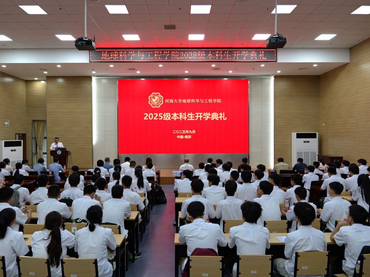 2025年9月8日下午,地球科学与工程学院2025级本科生开学典礼在笃学楼208隆重举行。学院党委书记马孟珂、院长刘瑾、党委副书记副院长张玲彬、副院长肖儒雅、地质系主任黄勇、测绘系主任沈月千、2025级地质1班班导师周盛涛、2025级地质2班班导师车文越、2025级地质3班班导师宋健、2025级测绘1班班导师夏诸葛、2025级测绘2班班导师谢京凯、2025级测绘3班班导师张立林、本科生教学秘书郑茜丹、组织员兼外事秘书李丽洁、团委书记常孝廉、2025级辅导员闫蕴琦、以及2025级全体本科生,共计200余人出席典礼。副院长赵燕容主持典礼。