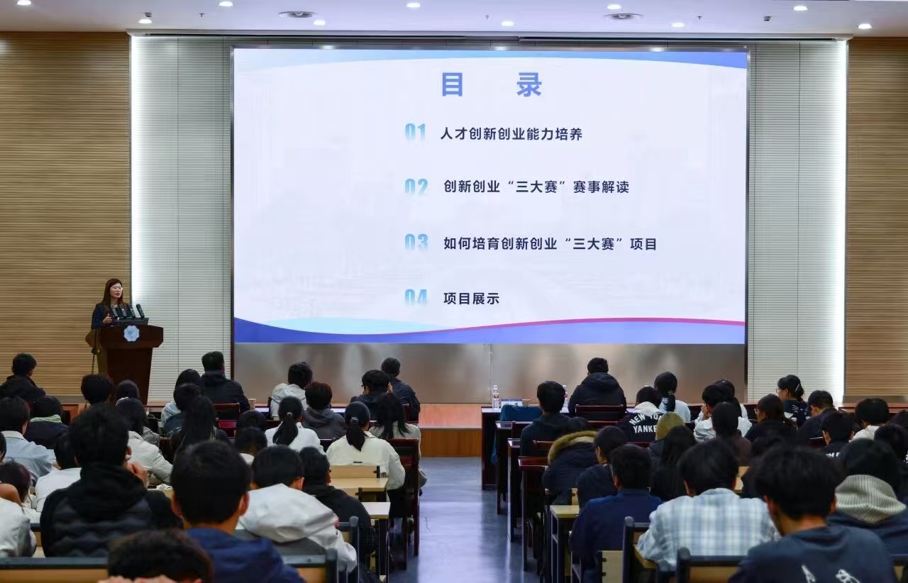 刘瑾院长结合国家战略需求、创新人才培养和重大赛事项目培育为各位同学进行生动的讲解,向同学们阐明了创新创业赛事旨在激发大学生的创造力和实践能力,希望同学们可以以此为契机,坚定目标、勇于探索、积极创新,在实践中增长才干,绽放青春力量。随后从赛事流程、申请书撰写、答辩技巧等方面,细致深入地做了具体介绍,让各位同学对于创新创业赛事有了更加深入的了解。