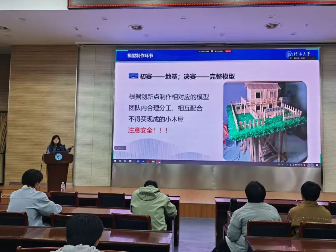宣讲会伊始,主持人王梓榆依次就赛事背景与核心意义、参赛模型的材料规范及设计要求、大赛评分标准三大核心板块,进行了全面细致的阐述。一方面帮助同学们摸清大赛意义、理清参赛要求,另一方面更让大家对参赛相关的大小事宜,都建立起清晰又系统的认知,参赛更有方向感!