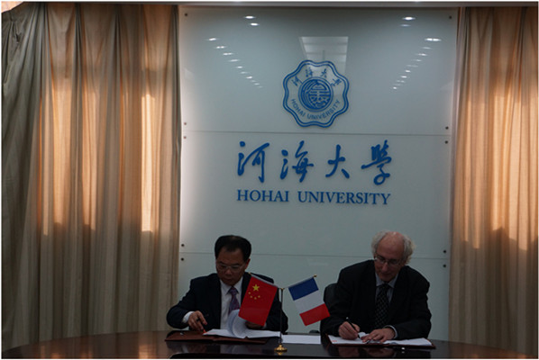 Prof. Xu showed warm welcome and pointed out that the long history of communication and solid foundation for cooperation between the two parties has born abundant fruits, which is worth to further development. Prof. Rollet expressed the high attention to the all-round cooperation also. He said Hohai University is an important partner of Université Lille 1. Prof. Xu and Prof. Rollet signed the agreement. Both wish the signed ceremony could strengthen the communication and deepen the cooperation in aspects such as education, research, exchange of staff and students. They also wish to develop the cooperation in Msc and PhD programs, so that both could achieve mutual benefit from such cooperation.