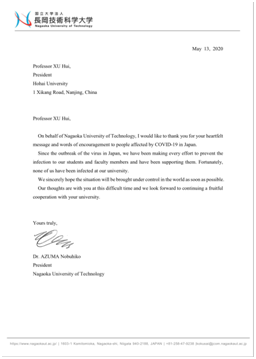 Professor Azuma Nobuhiko, President of Nagaoka University of Technology in Japan, thanked President Xu Hui sincerely for his concerns and encouragement to NUT in his reply. Japan experiences the same difficulty as China does, and at the same time fully draws on the experience of China. Since the outbreak of the epidemic in Japan, there has been no infection of teachers and students in NUT campus. During this difficult period, Professor Azuma hopes to work with China to achieve the final victory of epidemic prevention and control.