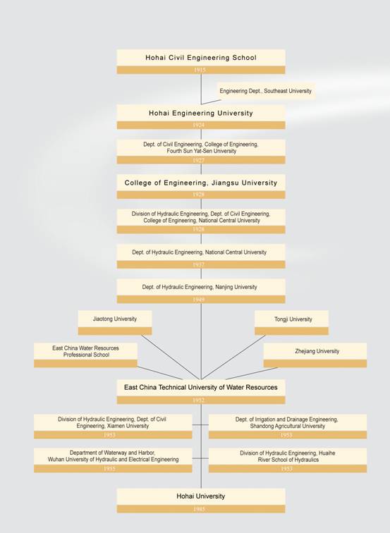 Hohai Civil Engineering School was founded in 1915 and was merged with the Department of Engineering of Southeast University into Hohai College of Engineering in 1924 and later incorporated the Fourth Zhongshan University in 1927 and became the Department of Water Resources, Central University in 1928. With the establishment of the People's Republic of China in 1949, it became the Department of Water Resources, Nanjing University. In 1952 the Departments of Water Conservancy, Hydrology, and Water Resources of Nanjing University, Jiaotong University, Tongji University, Zhejiang University and the East China Engineering School of Water Resources were merged into the East China Technical University of Water Resources. In 1985 it resumed the original name Hohai again and was named Hohai University and the late leader, Mr. Deng Xiaoping, inscribed this name.