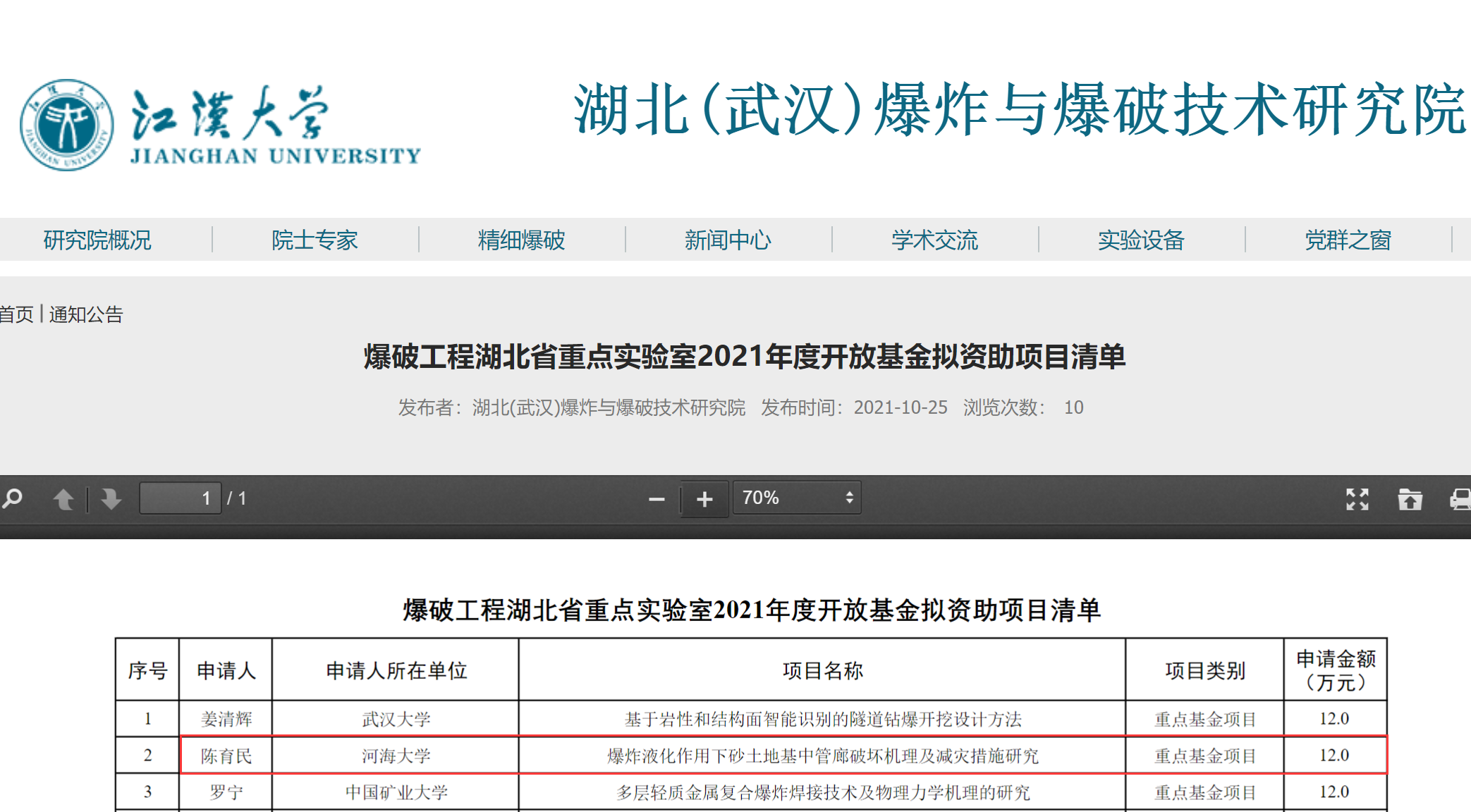 会议中实验室学术委员会全体委员对经专家评审的2021年度开放基金拟资助项目进行了投票表决,陈育民教授申报的爆炸液化作用下砂土地基中管廊破坏机理及减灾措施研究项目获爆破工程湖北省重点实验室2021年度开放基金资助。