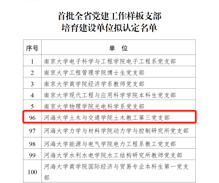 4月22日,省委教育工委公示了首批全省党建工作示范高校培育建设单位8个、标杆院系培育建设单位65个、样板支部培育建设单位505个。开云电竞网土木与交通学院土木教工第三党支部入选首批全省党建工作样板支部培育建设单位。