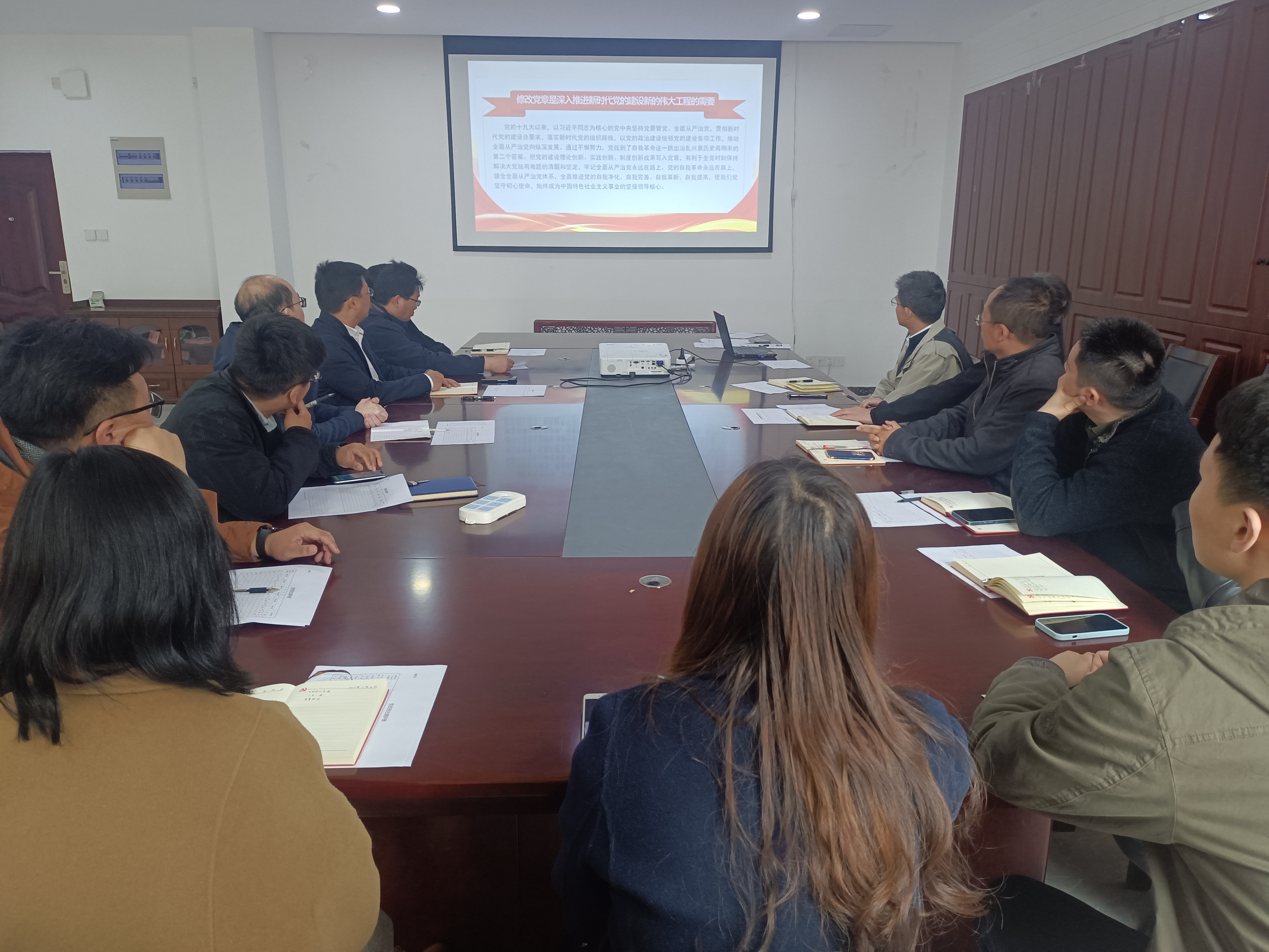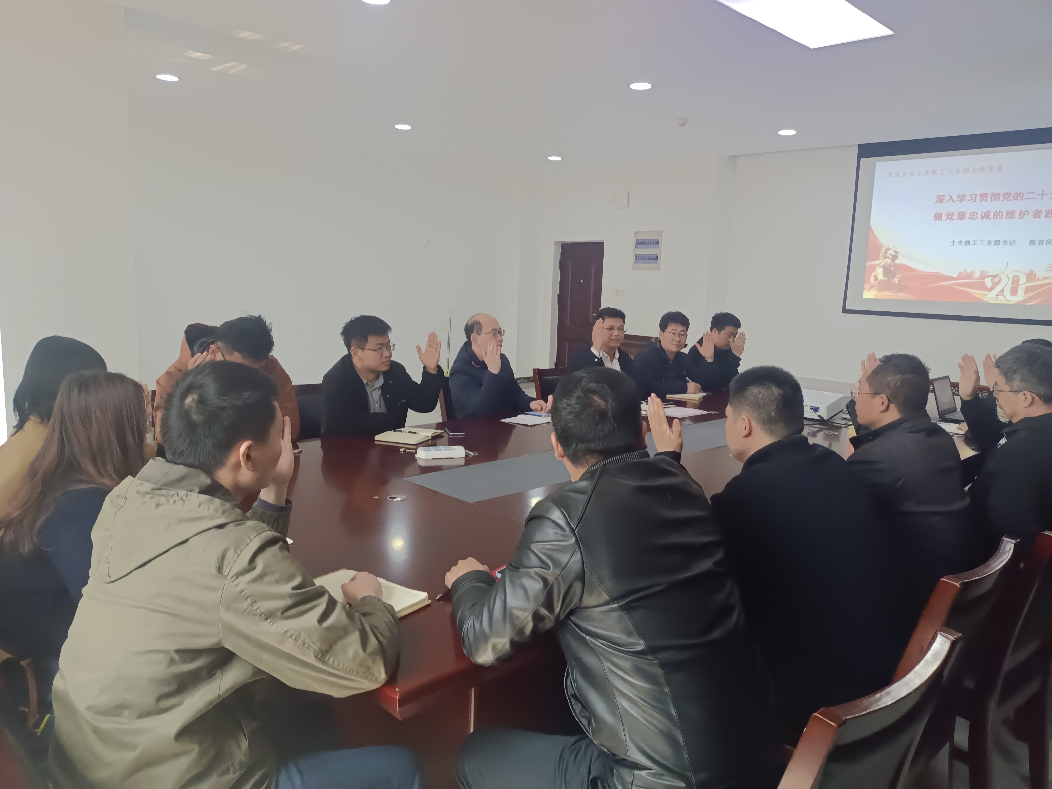 陈育民同志带领大家学习主题党课《深入学习贯彻党的二十大精神做党章忠诚的维护者践行者》,分别从党的二十大为什么要修改党章、二十大对党章作出哪些修改以及如何学习贯彻新党章三个部分进行讲解。习近平同志说过定要牢记党的初心使命,坚定理想信念,弘扬伟大建党精神,认真学习领会党的理论和路线方针政策,贯彻落实党中央关于全面建设社会主义现代化国家、全面推进中华民族伟大复兴的战略部署,更加自觉地学习党章、遵守党章、贯彻党章、维护党章,在思想上政治上行动上同党中央保持高度一致。