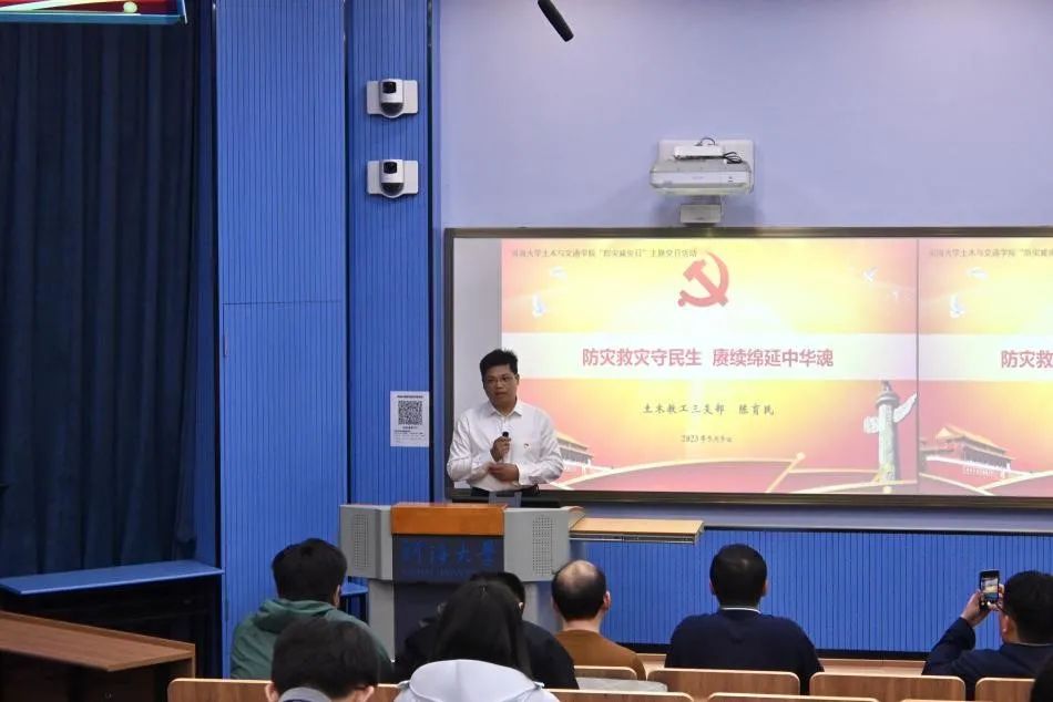 上午八点半,安全与防灾工程研究所所长、土木教工三支部书记陈育民教授作为主题党课宣讲人,于科学会堂101为各位党员同志们讲授了一堂内容丰富的“防灾减灾”主题党课。陈老师结合个人工作经历,分别从“全国防灾减灾日”、“灾害与土木工程”、“防灾减灾思政教学”以及“土木人的责任和使命”四个部分为党员同志们讲述了个人与各种灾害之间的关联,强调了作为一名土木人在防灾减灾事业中具有不可推卸的责任和担当。