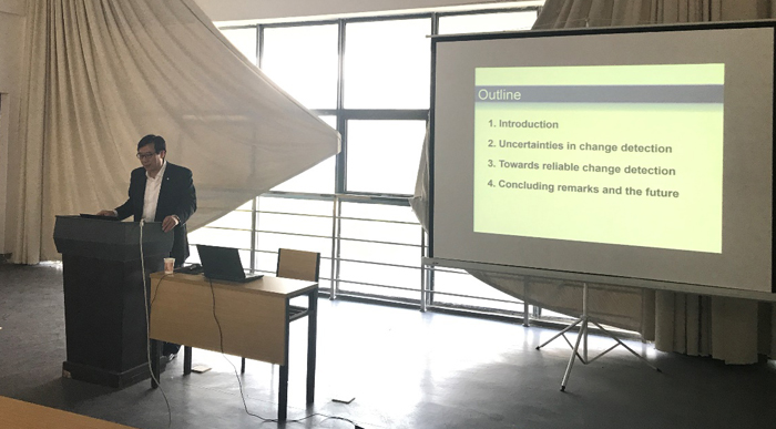 2017年4月24日下午,香港理工大学土地测量与地理资讯学系史文中教授在我院笃学楼208报告厅做了题为《基于遥感影像的动态监测技术》的学术报告,重点讲述了应用遥感影像进行动态监测所面临的不确定性和可靠性问题,围绕这两个核心问题展开,史教授分别介绍了动态监测中降低不确定和提高可靠性的方法和策略,最后对该领域未来的发展方向和所面临的挑战做了展望。史教授耐心回答了参会师生的提问,并就动态监测中的碰到的问题进行了深入讨论,使大家获益良多。