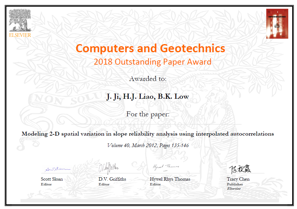 姬建教授研究论文“Modeling 2-D spatial variation in slope reliability analysis using interpolated autocorrelations”在2018年度被评为《Computers and Geotechnics》期刊近5年岩土工程领域最有影响的5篇论文之一,因此被授予最佳论文奖(2018 Outstanding Paper Award)。据悉,该类奖项的研究论文评选是基于近五年SCOPUS数据库他引情况由期刊主编等组成的委员会评出。