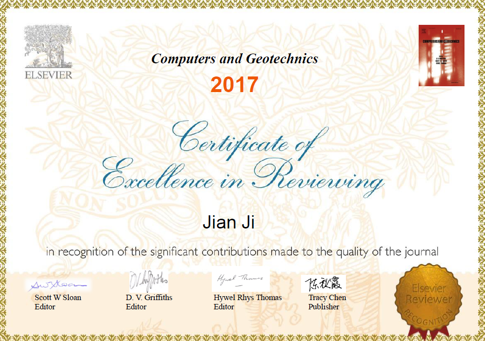 近日,岩土工程领域国际权威期刊《Computers and Geotechnics》公布2018年度最佳论文奖(2018 Best Paper Awards)和2017年度杰出审稿人(2017 Top Reviewers),岩土所姬建教授同时获得上述两项奖励证书。