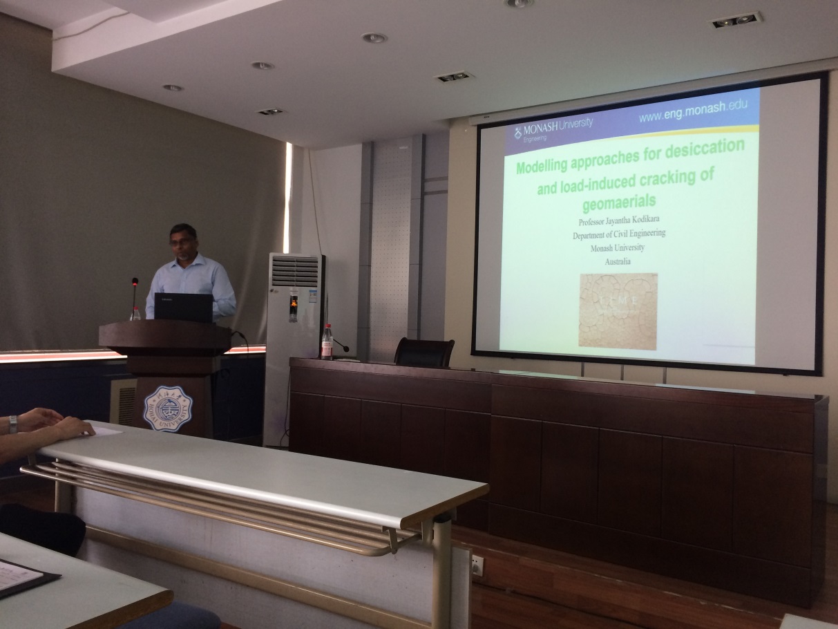 受我所姬建教授的邀请,澳大利亚莫纳什大学(MONASH)土木工程学院执行院长Jayantha Kodikara教授于5月17至18日在我院进行学术交流。17日上午,高玉峰院长亲切接见了Kodikara院长的来访,并就莫纳什土木工程学院与我院在科研、国际生交流等方面的合作事宜进行了洽谈。随后,Kodikara教授在科学馆516报告厅做了题目为“Modelling Approaches for Desiccation and Load-induced Cracking of Geo-materials”的报告,学术报告由高玉峰院长主持,学院教师、研究生以及其他相关学院的学者参与了此次讲座。