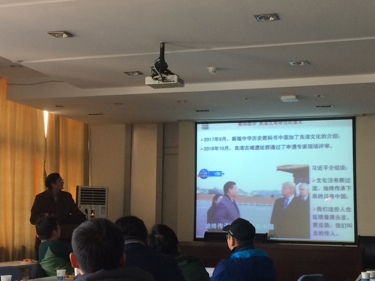 赵晓豹副教授做了题为“良渚文明”的学术报告,对良渚文明内涵、良渚遗址群、良渚古城外围水利系统和代表文物等方面进行了详细介绍。良渚文化及其所代表的良渚文明距今约5000年左右,大体与古埃及文明、苏美尔文明、哈拉帕文明处于同一时代。良渚文化分布以太湖流域为中心,南至浙南,北跨长江到达苏北,西起皖东,东达舟山群岛。目前良渚文化共发现近600处遗址,其中以余杭区瓶窑镇和良渚镇附近的良诸文化遗址群最为集中和代表。良渚古城水利系统是中国目前发现的最早水利系统,目前已发现11条水坝,整个水利系统在良渚古城北部和西北部形成面积约13平方公里的储水面。良渚遗址水利系统主要分为塘山的水前长堤、北部的高坝系统和南部的低坝系统,许多区域采用草裹泥的方式来加固坝体,良渚遗址的塘山和岗公岭等水利设施年代可能早到4900至5000年,比大禹治水的年代提早了近1000年。最后,赵教授深刻介绍了良渚文明对中华文明形成的影响。中国历史和文化是不曾断灭过的,良渚文化经过几千年的发展演变,最终融入到了一个大的中华文化之中了,我们从良渚文化的研究中,看到了中华文明从多元走向一体的过程,良渚遗址群将成为实证中华五千年文明史的圣地。