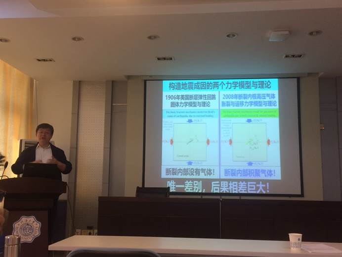 岳中琦教授做了题为“地震的极高压甲烷天然气体成因与机理”的学术报告,介绍了从2008年汶川地震到2019年长宁地震的一系列调查、发现、论证和证实工作。创新性地提出了断裂内极高压气体胀裂与运移力学模型与理论,认为地震是地球深部极高压甲烷天然气胀裂挤压断裂岩体、再挤胀逃出断裂带造成的。岳教授指出,这一研究工作不仅和传统的地质学、地震学及工程学相结合,而且与能源及气候变化领域紧密相关,将大大丰富地震研究领域和内容。报告结束后,岳中琦教授与我院师生进行了热烈的讨论。